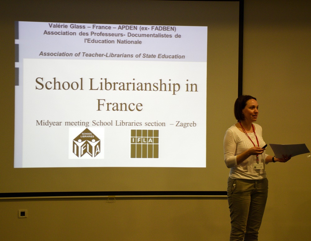 Situaciju u Francuskoj ukratko nam je predstavila mlada gošća Valerie Glass, a naglasak je stavila na povijest francuskoga školskog knjižničarstva, ulogu i dužnost francuskih nastavnika-knjižničara te na poteškoće vezane za struku s kojima se knjižničari suočavaju. Školske knjižnice u Francuskoj nazivaju se Centri za dokumentaciju i informacije  (engl. CDI – Centres of Documentation and Information) i već su duže vrijeme središte procesa poučavanja. Od 1989. francuski školski knjižničari smatraju se nastavnicima i poznati su pod nazivom “professeurs documentaliste”. Njihova je misija uvođenje i obuka učenika za pristup, vrednovanje i  korištenje informacija u dokumentacijskim centrima za koje su zaduženi.