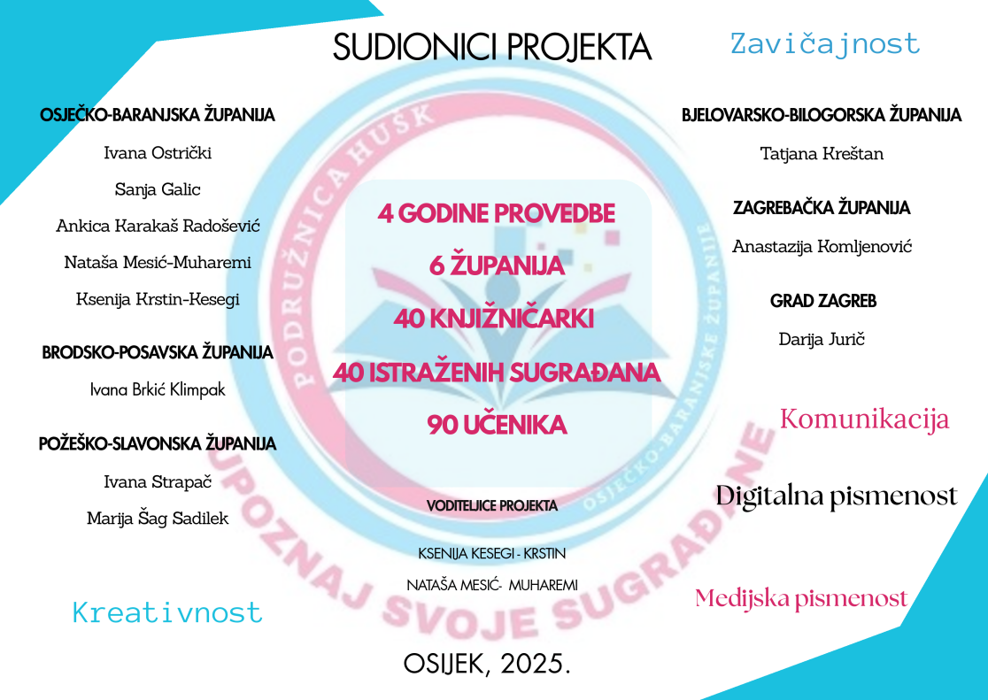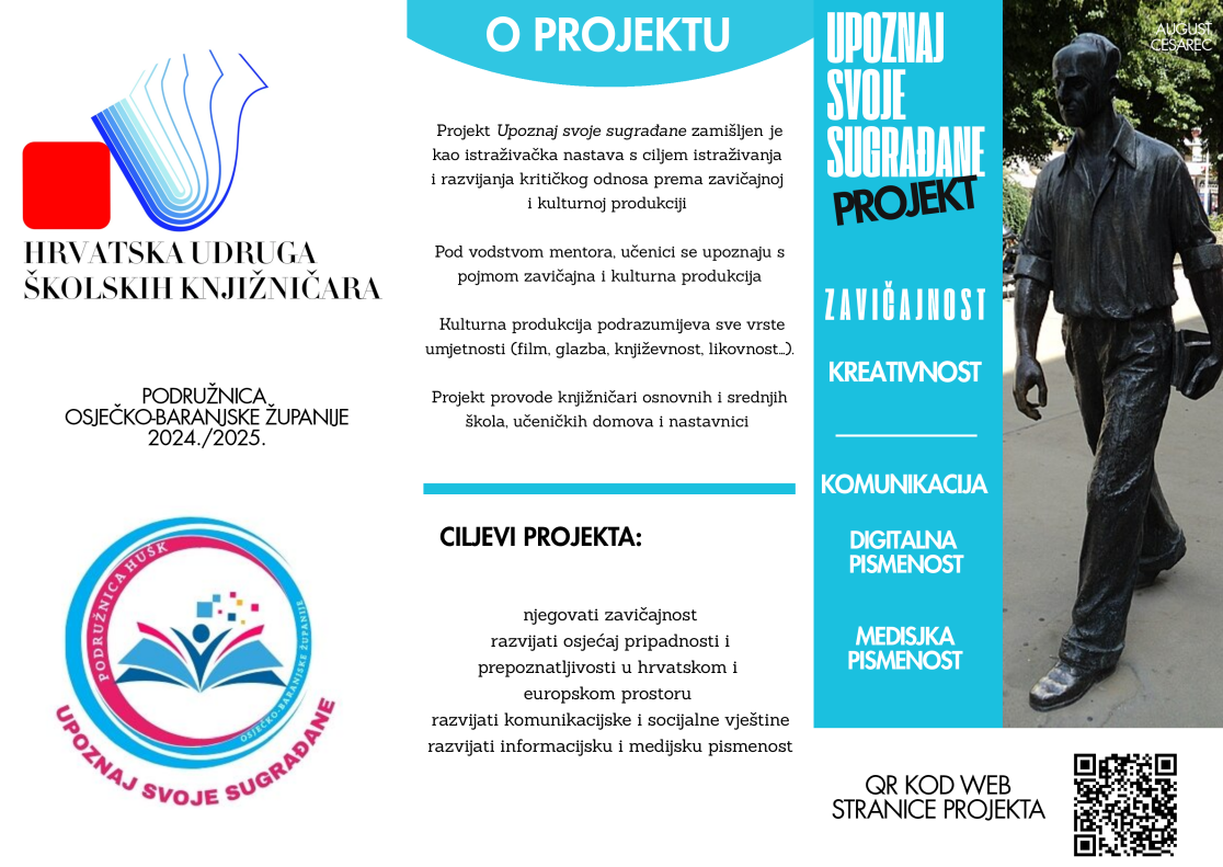 Projekt Upoznaj svoje sugrađane nastao je iz potrebe da se školska knjižnica afirmira kao središnje mjesto istraživanja, kulturne razmjene i osobnog i zajedničkog oblikovanja identiteta. Riječ je o višegodišnjoj inicijativi Podružnice Hrvatske udruge školskih knjižničara Osječko-baranjske županije, osmišljenoj kao oblik istraživačke nastave, čiji je glavni cilj potaknuti učenike na kritičko promišljanje zavičajnosti i njezinu interpretaciju kroz suvremene oblike kulturne produkcije.